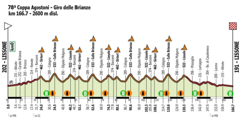 サーキットには以下の3つの登坂区間が含まれます。Sirtori:1.5 km/平均4.9%(最大12%)、ColleBrianza:3.8 km/平均6%(最大11%)、Lissolo:5.4 km/平均4.3%(最大15%)。最後のリッソーロの登坂はフィニッシュまで残り36.4km地点で終わり、その後は緩やかなアップダウンを経て、ラスト15kmはほぼフラットでフィニッシュへと向かいます。