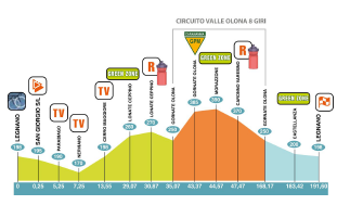 レースはレニャーノをスタート・フィニッシュ地点とし、全長191.6kmで行われます。最初の35kmはほぼフラットで、その後「ヴァッレ・オローナ・サーキット( Valle Olona)」に入ります。1周16.6kmのコースを8周します。