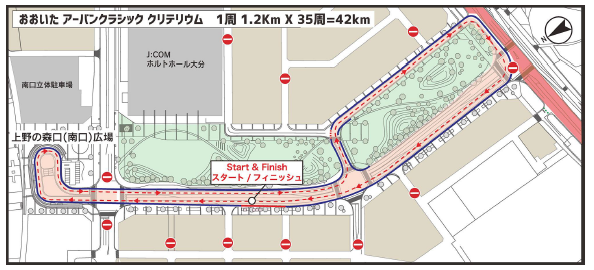 1周1.2km を35周する42kmのコースは、新たに大分駅上野の森口広場のロータリーがコースに加わった。ヘアピンコーナーがなくなったため、昨年よりコース自体の難易度は下がったはが、集団内での位置取りの難易度が上がった印象。